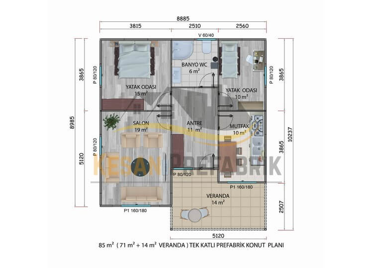 85 m² Tek Katlı Prefabrik Ev kurulacağı bölgenin iklim şartlarını (kar yükleri, rüzgâr hızlarını ) ve depremsel koşullarını göze alarak standart malzeme seçimi yapmaktadır. Prefabrik yapılar diğer yapılara göre daha esnek yapıldığı için deprem ve zemin kaymalarına karşı oldukça dayanıklıdır. Isı ve ses yalıtımlarının diğer yapılara göre çok daha fazla olması sebebiyle oldukça kullanışlı yapılardır. Prefabrik yapıların son derece dayanıklı olması ve oldukça uygun fiyatla üretilmesi, insanlar üzerinde olumlu etki bırakmasına neden olmaktadır.