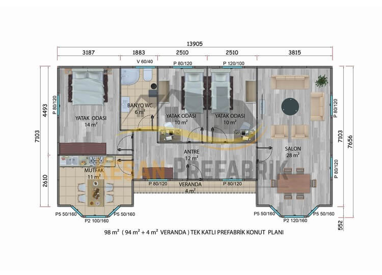 98 m² Tek Katlı Prefabrik Ev kurulacağı bölgenin iklim şartlarını (kar yükleri, rüzgâr hızlarını ) ve depremsel koşullarını göze alarak standart malzeme seçimi yapmaktadır. Prefabrik yapılar diğer yapılara göre daha esnek yapıldığı için deprem ve zemin kaymalarına karşı oldukça dayanıklıdır. Isı ve ses yalıtımlarının diğer yapılara göre çok daha fazla olması sebebiyle oldukça kullanışlı yapılardır. Prefabrik yapıların son derece dayanıklı olması ve oldukça uygun fiyatla üretilmesi, insanlar üzerinde olumlu etki bırakmasına neden olmaktadır.